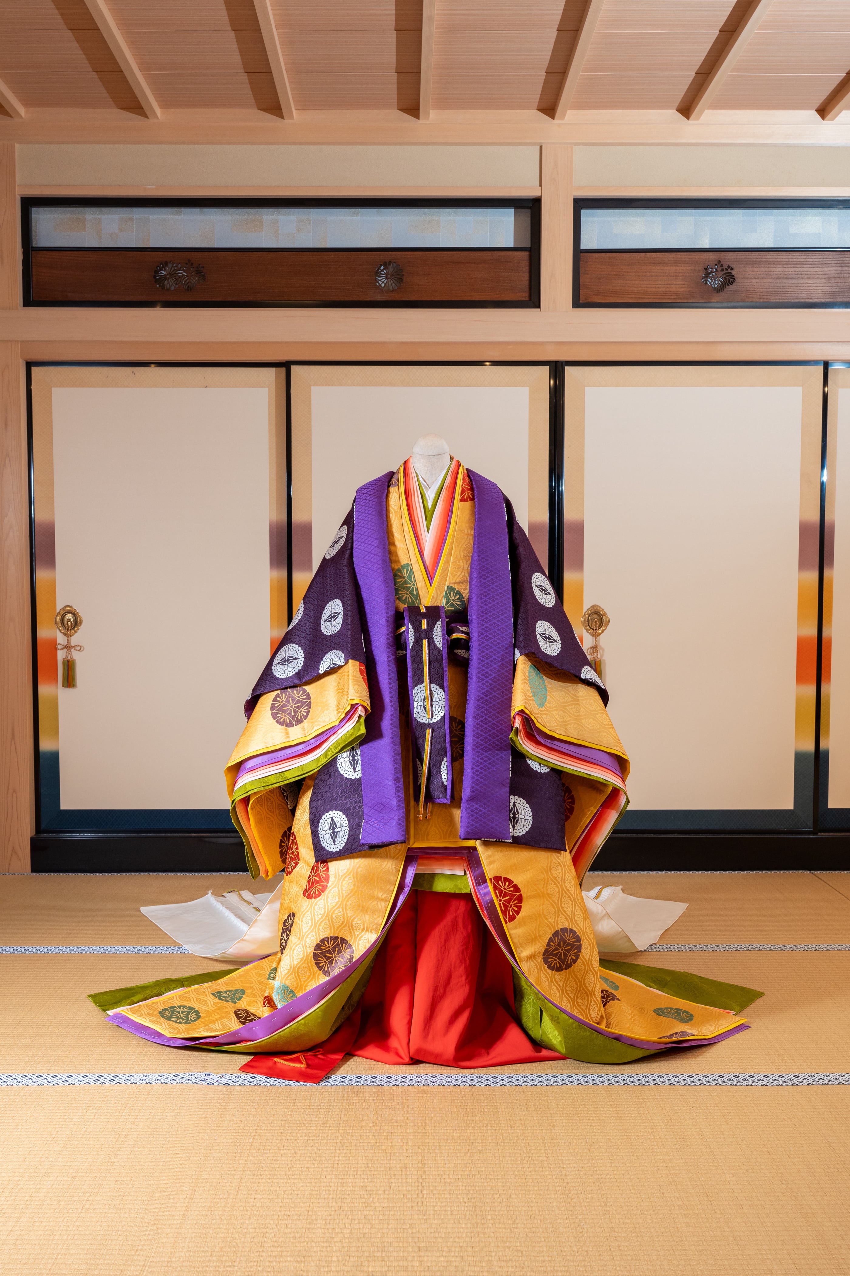 ◎一榮十二単の特徴として、唐衣の紋の配置、唐衣の袖まで紋を合わせています。 ◎1寸3針の装束仕立てで、制作しています。 ◎摺り紋は、日本でも有名なお店に依頼しています。本格的です。 ※こちらの唐衣と裳を十二単一式でご購入希望のかたは【セット】をご覧ください。着用姿も載せています。 ◇唐衣 亀甲地窠に3色向蝶丸紋 表薄紫・裏薄桃 ◇裳 桐竹鳳凰紋 ◇生地・・・テトロン